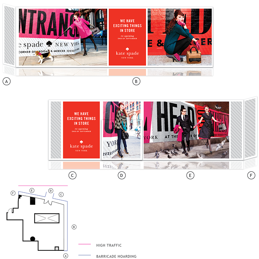 kate spade, ifc - hong kong; store barricade visual merchandising design; colorways and full layout development
